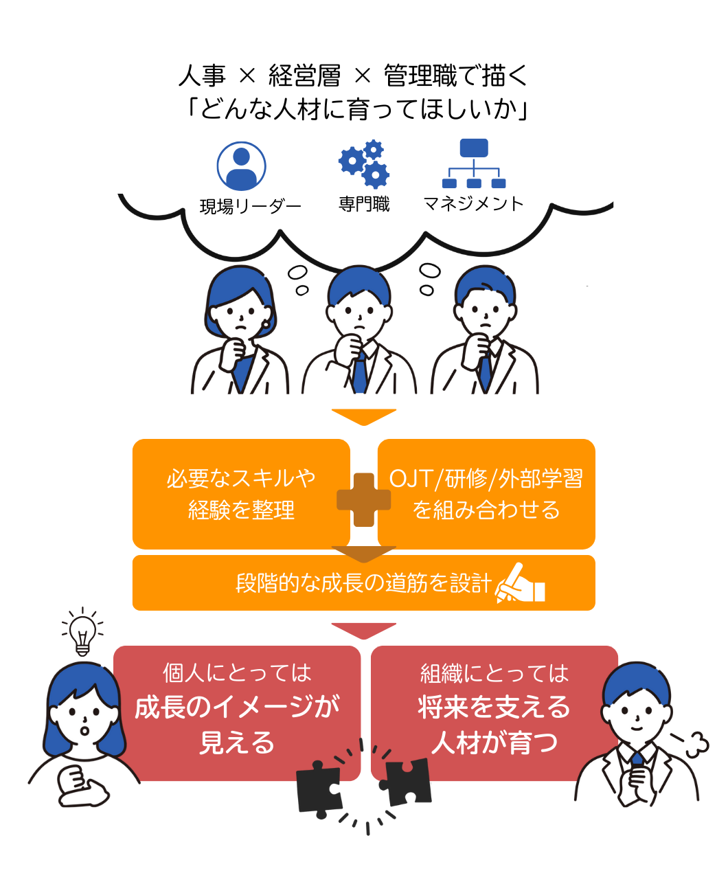 ここでは、人事担当者だけでなく、経営層・管理職も一緒になって「どんな人材に育ってほしいのか」を描くことが欠かせません。