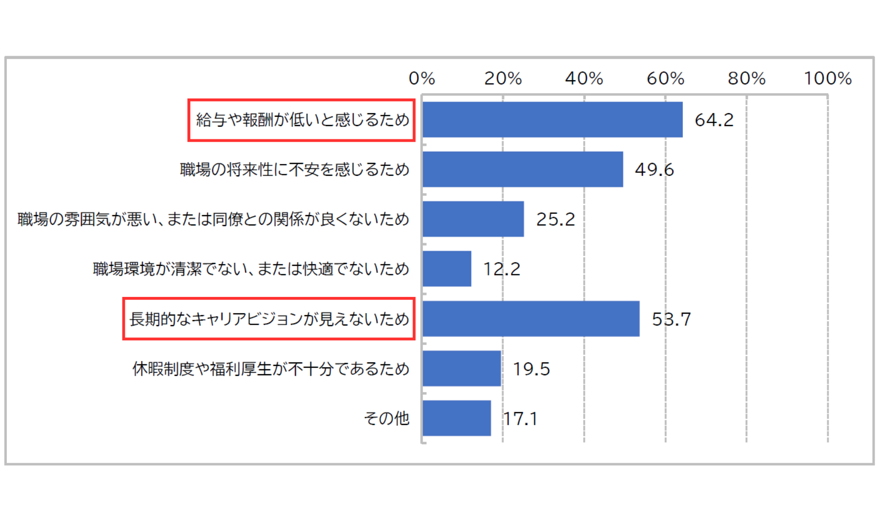 現在の職場で働き続けたくない理由の第1位は「給与の低さ(64.2%)」に続いて、第2位には「長期的なキャリアビジョンが見えない(53.7%)」が挙げられています。