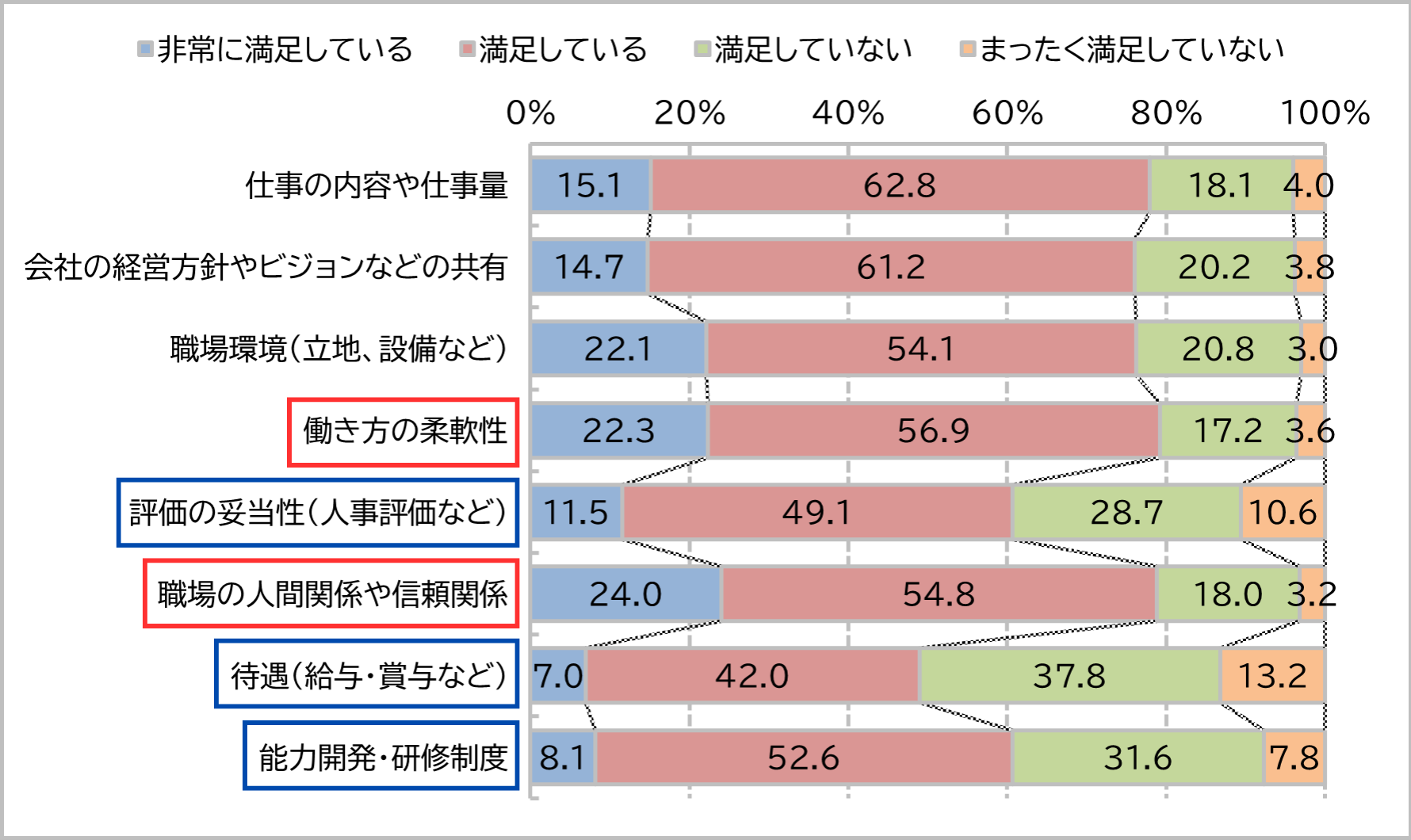 一方、現在の仕事(勤務先)に対する満足度の結果を見ると、「職場の人間関係や信頼関係」や「働き方の柔軟性」には一定の評価があるものの、