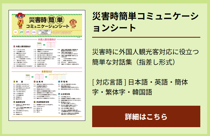 本コミュニケーションシートは、災害時に外国人観光客と県民・観光関連事業者が速やかに意思疎通を図り、観光客の安全安心を確保するための指さし形式の簡単な対話集です。